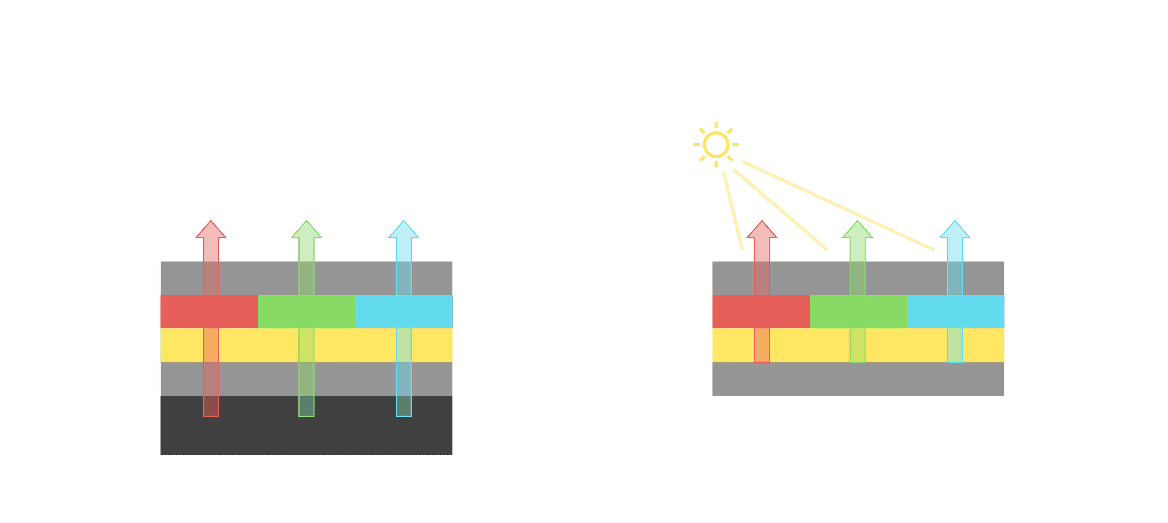 与传统需搭配背光单元的液晶显示相比,,反射式液晶技术不仅更省电、、更轻薄,,,且即便在艳阳下仍能清晰显示。。。此外,,少了背光单元,,也大幅降低了 LED 蓝光伤害眼睛的疑虑。。。