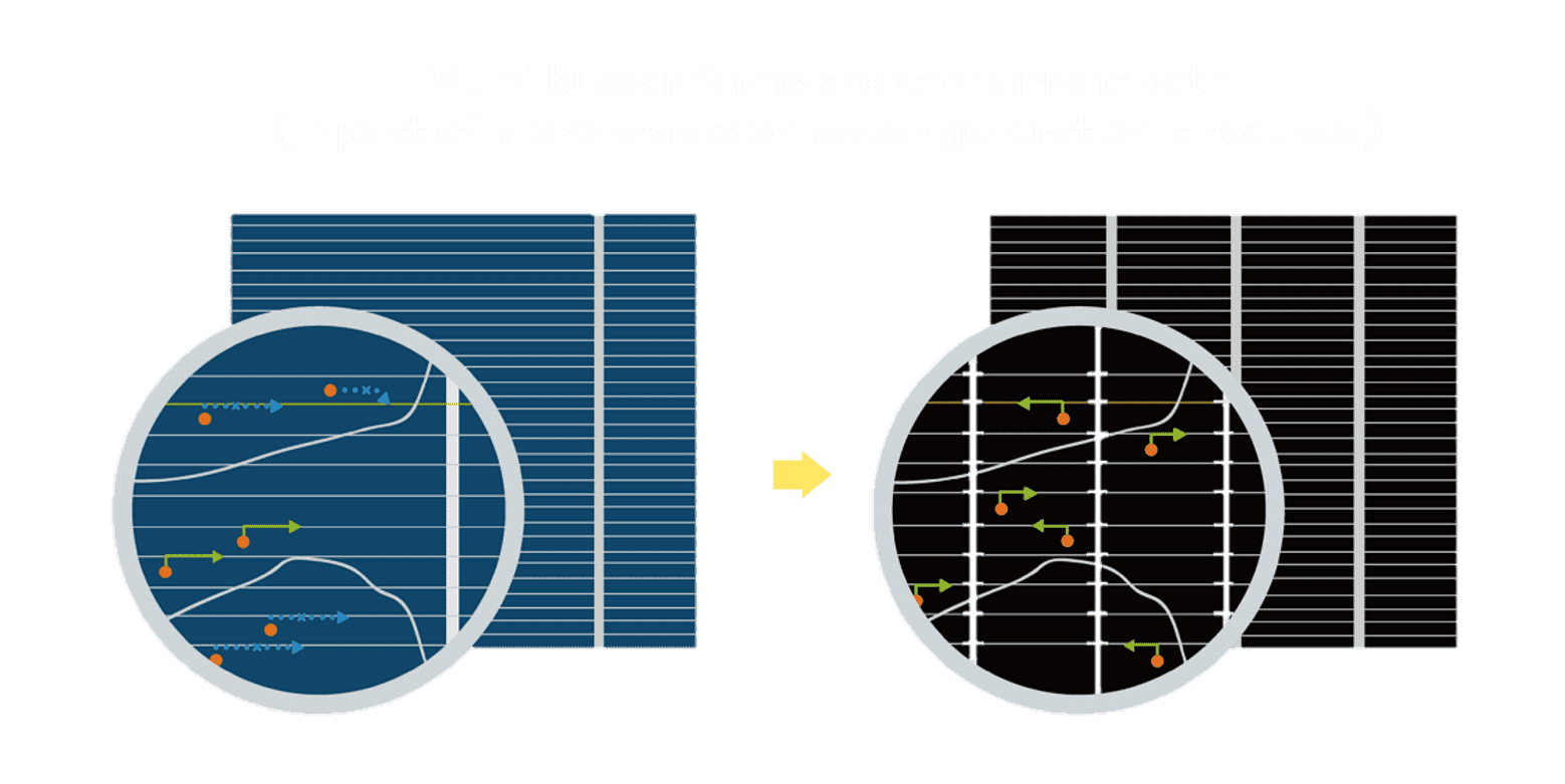- 电池使用多条铜导线 (Copper wire) 于电池片上形成较短的电流路径,,,提高电流收集效率,,采用圆形设计的铜导线较传统扁平式的铜焊带 (Ribbon),,可增加入射至电池的光线量。。。。
